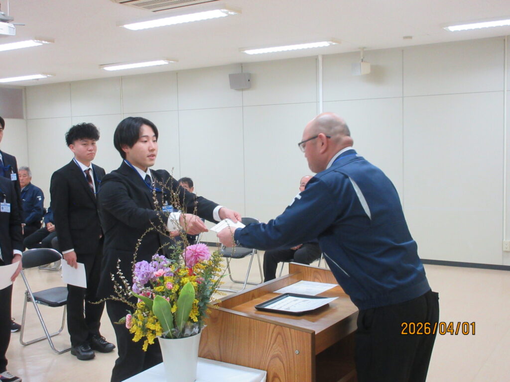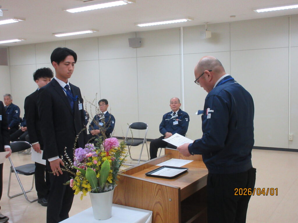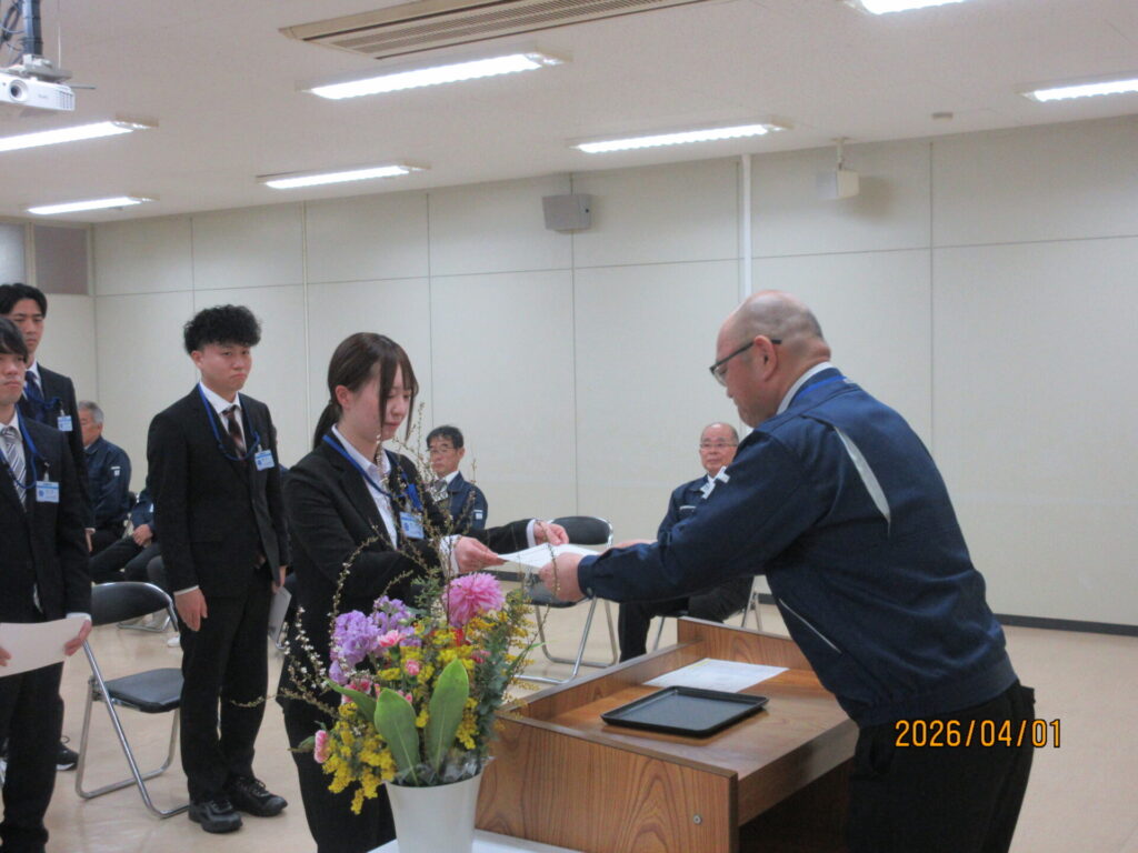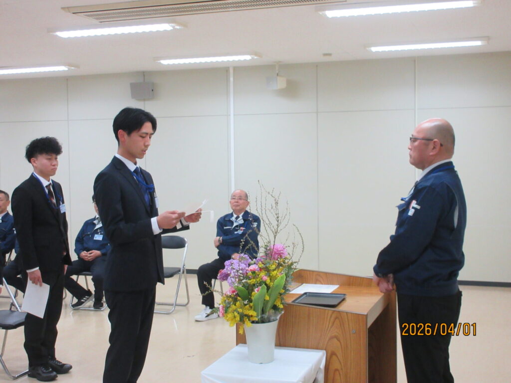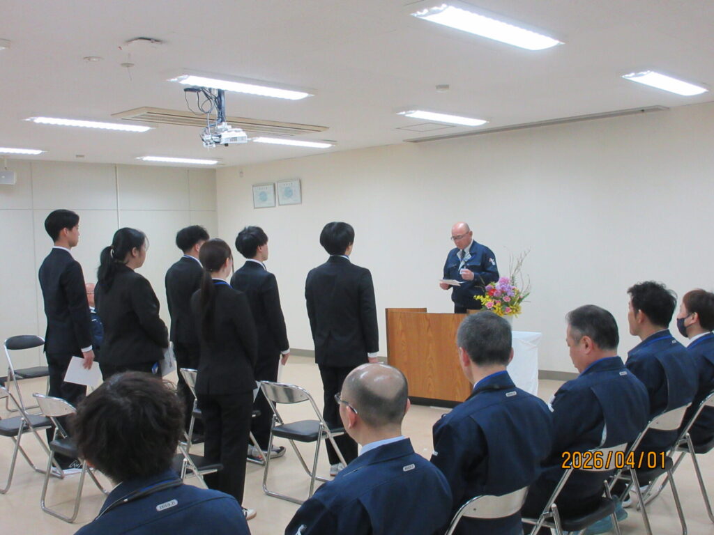 新入社員へ辞令の交付、社長からの祝辞、役員・幹部の紹介、従業員代表からの歓迎のあいさつを行い、最後は新入社員からの決意の言葉をいただき終了となりました。