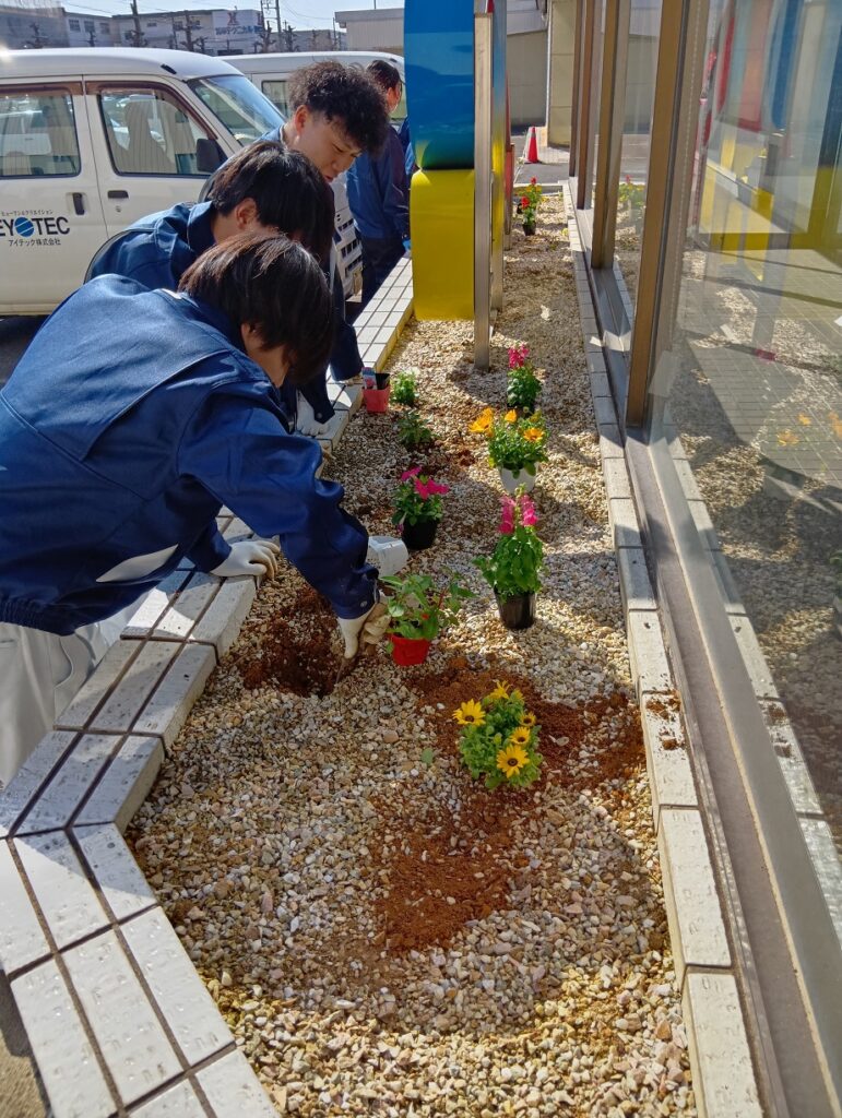 4月8日の午後、会社の玄関前花壇に花を植えました。